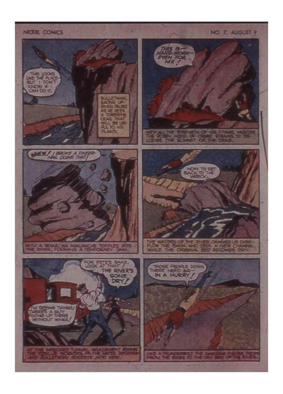 First saving passengers traveling the rails through a tunnel under a river and then a rail traversing above ground, Bulletman is able to save scores of lives while racking up property damage on scale with the saboteurs. It is revealed that Kort was the man behind the scenes manipulating these attacks, in order the cause Grenville's company stock to fall allowing him to buy controlling interest in it. *Yawn*